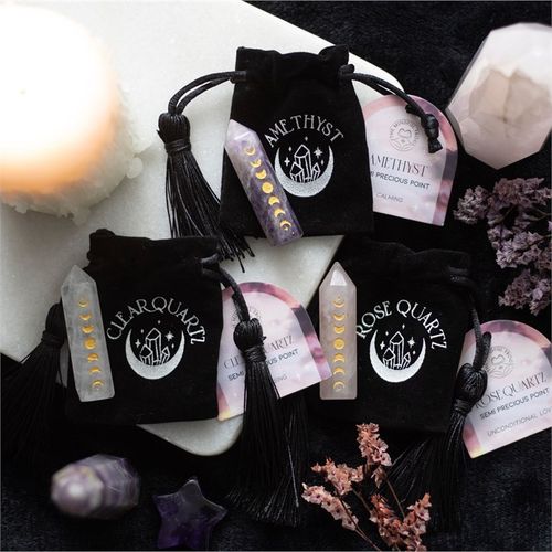 This beautiful clear quartz crystal point is perfect in size for travel altars, desk decor or taking on the go for extra protection. Features a gold-tone moon phase engraving and comes with a matching drawstring bag for storage and safe-keeping.