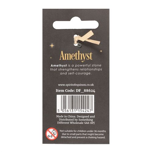 Harness the power of crystal healing with this mushroom gemstone keyring crafted from polished amethyst. The keyring features a mushroom-shaped gemstone attached to a gold keyring with a matching informational tag. Amethyst is a popular stone that promotes courage and strengthens relationships by radiating positive energy into your surroundings. Due to its nature, stone may vary in size, shape and colour.