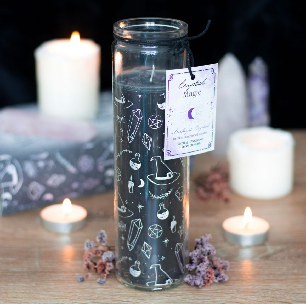 Inspired by the traditional 7 day prayer candles, this tube candle comes in a beautiful jasmine fragrance and infused with amethyst crystal chips to promote a sense of calm, protection and inner strength. This vegan candle is decorated with a mystical design featuring crystals, witch hats and potions, making it a perfect gift for crystal collectors and witchcraft enthusiasts.