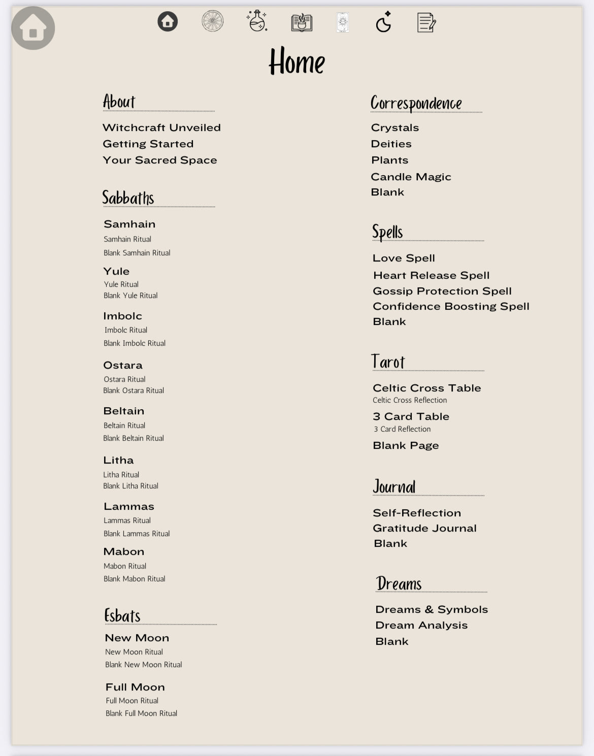 Step into the world of witchcraft with our Digital Grimoire, a beautifully crafted, book filled with spells, rituals, correspondences, and more!
