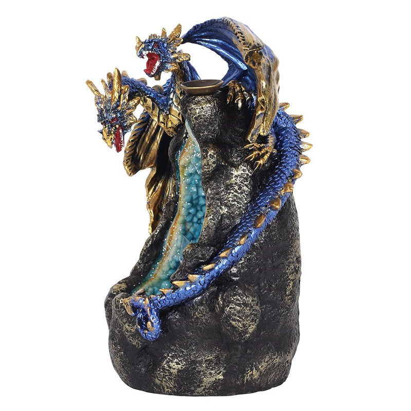 This stunning incense burner is an intricate and impressive glowing dragon cave design. This burner features glowing crystals which change colour in a geode-like opening. When the cone is lit the smoke from the cone cascades downwards in a mesmerising waterfall effect to pool at the bottom. Beautiful to watch.