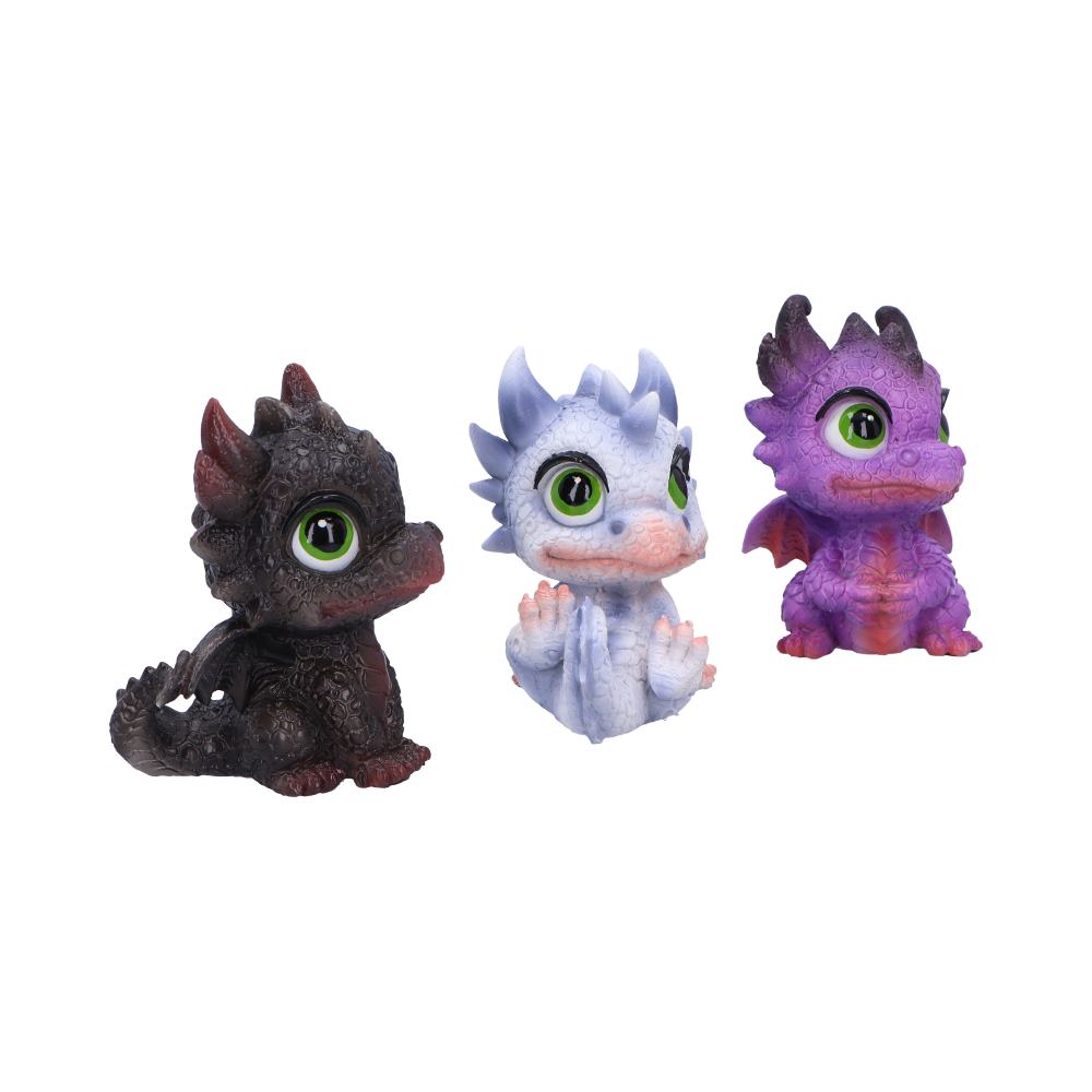 Unleash the charm of mythical creatures with our Little Hordlings Set from Nemesis Now's value collection. This set features three adorable dragonlings, each with irresistibly bulging green eyes. The first dragon, in classic black, gazes upward with a sense of wonder. The second, a tranquil light blue, lies relaxed on its back, hind legs playfully raised. The third, a charming purple, sits with front claws clutched together in a nervous yet endearing pose.