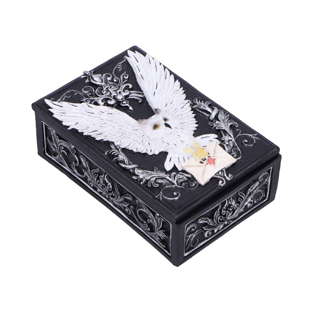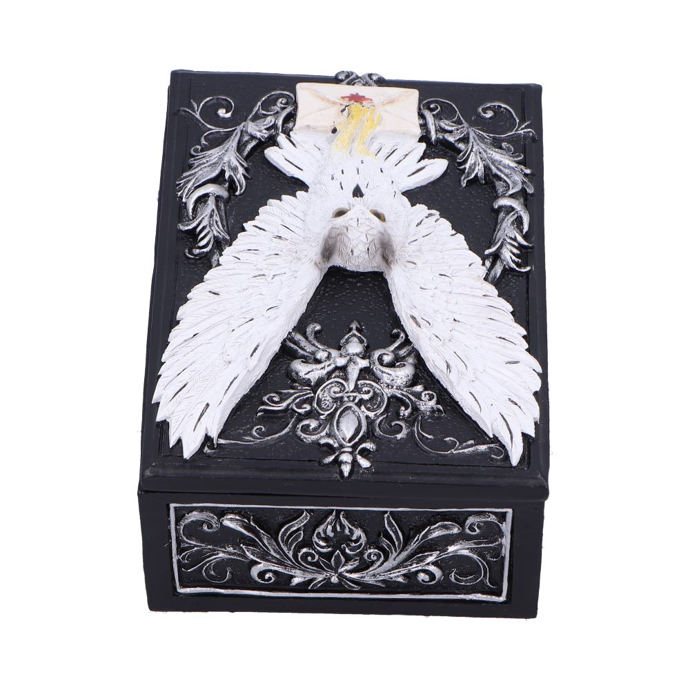 A Majestic Trinket Box with a Gothic Twist. The Owl Messenger Box is a stunning trinket box that combines elegance, mystery, and a touch of gothic allure. At the heart of the design is a beautifully sculpted white snowy owl, delicately holding a sealed letter in its beak, evoking an aura of magic and mysticism. The owl is perched gracefully amidst intricate gothic floral patterns, making this piece a captivating addition for lovers of fantasy and the mystical. Crafted from high-quality resin and hand-painted with precision, the Owl Messenger Box is not only visually enchanting but also highly functional. Perfect for storing jewellery, tarot cards, or small treasures, it ensures your items are kept safe in a beautifully unique container. Whether displayed as an eye-catching statement piece or used to protect your precious keepsakes, this box adds a sense of wonder and charm to any space. Carefully packaged to ensure it arrives in perfect condition, the Owl Messenger Box is an ideal gift for collectors, fantasy enthusiasts, or anyone enchanted by the mystical and mysterious. Its blend of practical use and enchanting design makes it a perfect addition to any home or collection, adding a touch of elegance and magic to any room.