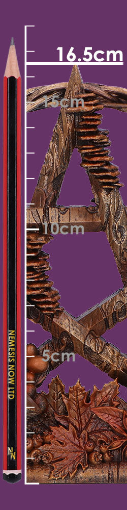 Enhance your space with the essence of Autumnal beauty with our Season of the Pentagram Mabon. This autumnal floral decorative pentagram ornament, inspired by the Pagan holiday Mabon, is ideal for Wiccan enthusiasts. Featuring a resin wooden look base and pentagram adorned with beautiful warm-coloured leaves, it embodies the season's abundance. Packaged in a well-presented Nemesis Now branded gift box, it's a proud addition to your home shelves. Perfect for those interested in Wiccan and Pagan decor.