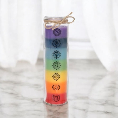 This beautiful candle is presented in a tall glass holder with seven layers of coloured wax, each representing one of the seven chakras and features the corresponding chakra symbol. The perfect gift for someone who enjoys yoga or reiki to help enhance their spiritual and physical wellbeing.